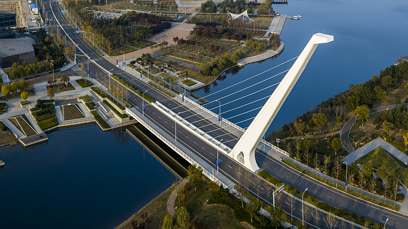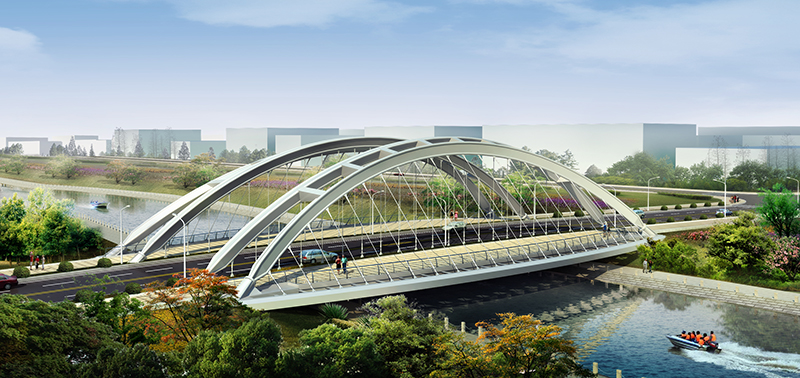 匯智橋路南、北橋均為無背索獨塔單索面斜拉橋,橋跨 82 米,全寬 33.5 米;智力島路橋為單跨新型斜靠式拱肋下承式梁拱組合體系橋,橋跨 70 米,寬度 33.5-42.9 米;聚賢橋路南橋為上承式梁拱組合橋,橋跨組合為16.5+59+16.5=92 米,寬度 30 米;聚賢橋路北橋為斜腿剛構橋,橋跨組合為 21+28+21=70 米,寬度 30 米。